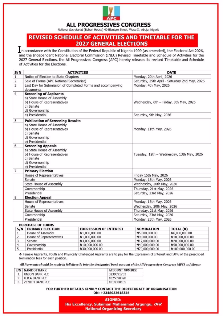 The updated schedule, dated April 27, 2026, was signed by the party’s National Organising Secretary, Sulaiman Muhammad Argungu, and confirmed by National Publicity Secretary, Felix Morka.