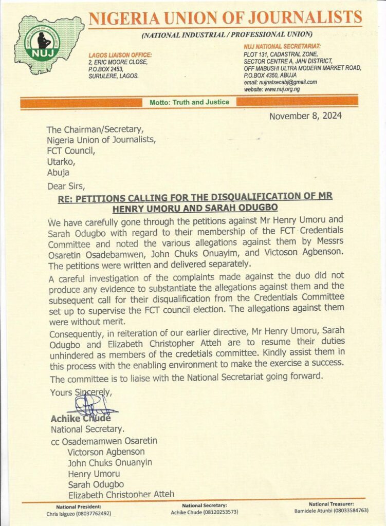 The National Secretariat of the Nigeria Union of Journalists NUJ on Friday cleared the allegations leveled against the 3 member credential Commitee for the December 2024 FCT NUJ election.