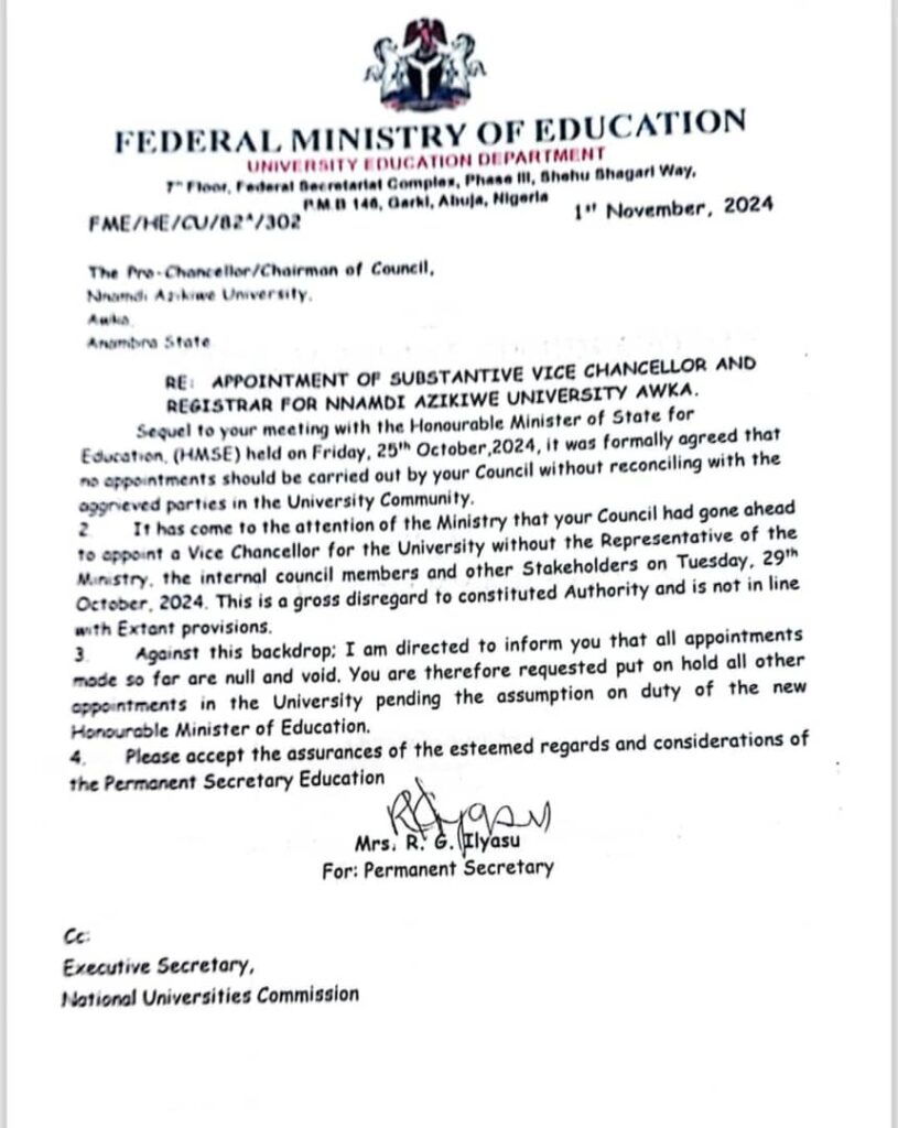 In a new development, a letter dated November 1, 2024 and signed by Mrs. R. G. Ilyasu on behalf of the Permanent Secretary, Federal Ministry of Education with reference number, FME/HE/CU/82/302 addressed to the Pro-Chancellor of the university, surfaced in the media over the weekend. According to the letter, the appointment of the new Vice Chancellor and Registrar of the institution was tagged “null and void.”