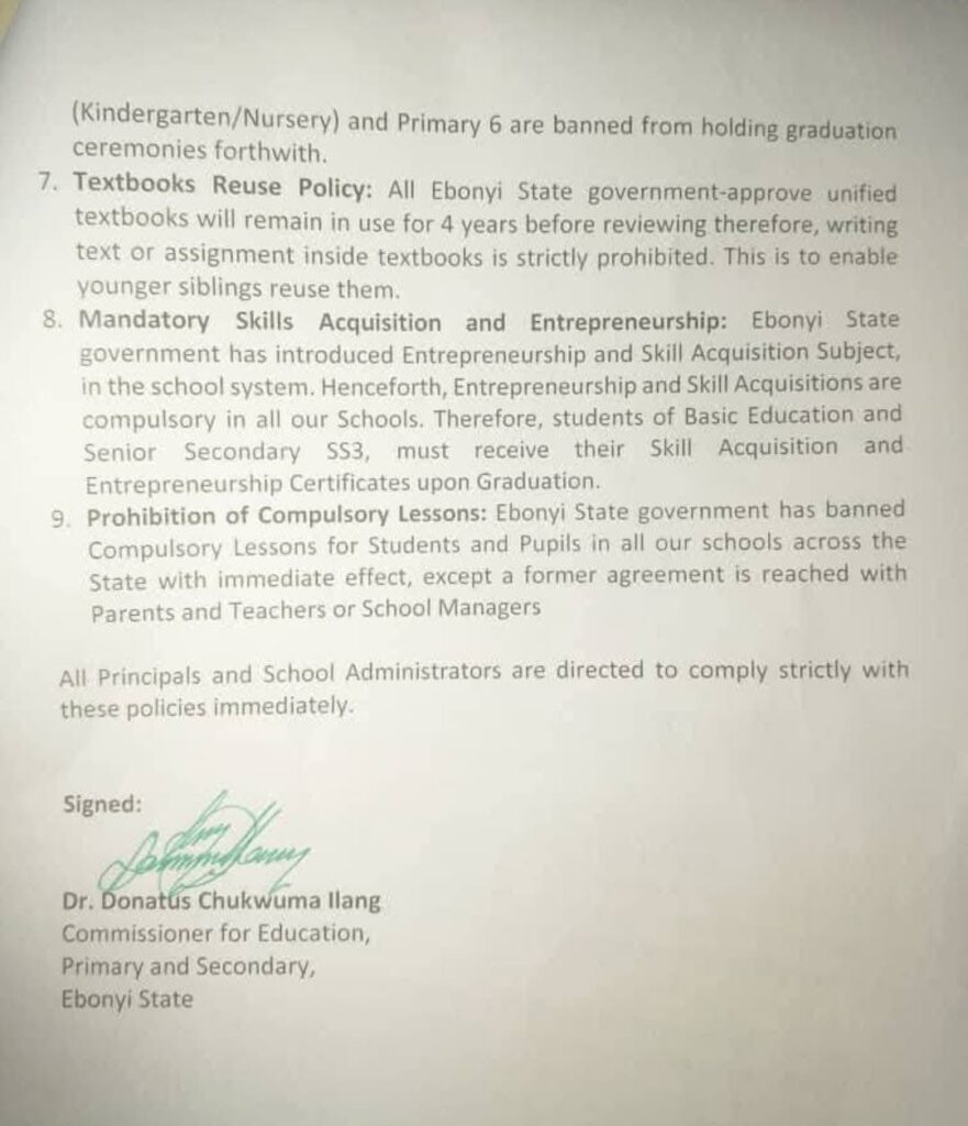 The ban is part of the “Ebonyi State New Education Policy” announced on September 1, 2025 by the state’s Commissioner for Education (Primary and Secondary), Dr. Donatus Chukwuma Ilang.