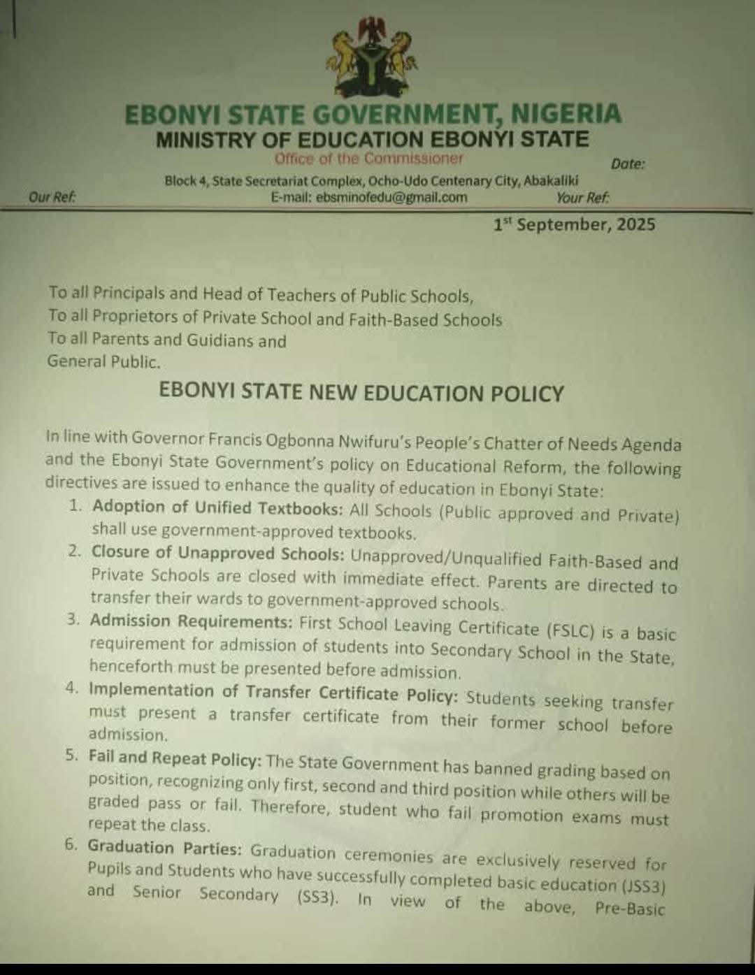 The ban is part of the “Ebonyi State New Education Policy” announced on September 1, 2025 by the state’s Commissioner for Education (Primary and Secondary), Dr. Donatus Chukwuma Ilang.
