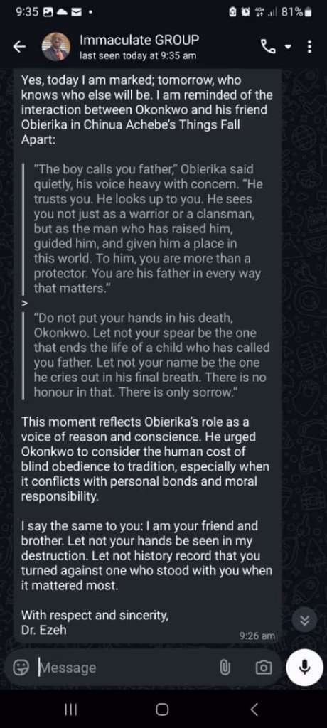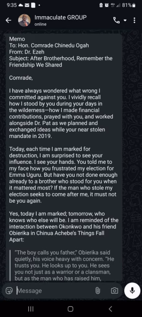 “Today, each time I am marked for destruction, I am surprised to see your influence. I see your hands. You told me to my face how you frustrated my election for Emma Uguru. But have you not done enough already to a brother who stood for you when it mattered most? If the man who stole my election seeks to come after me, it must not be you again.