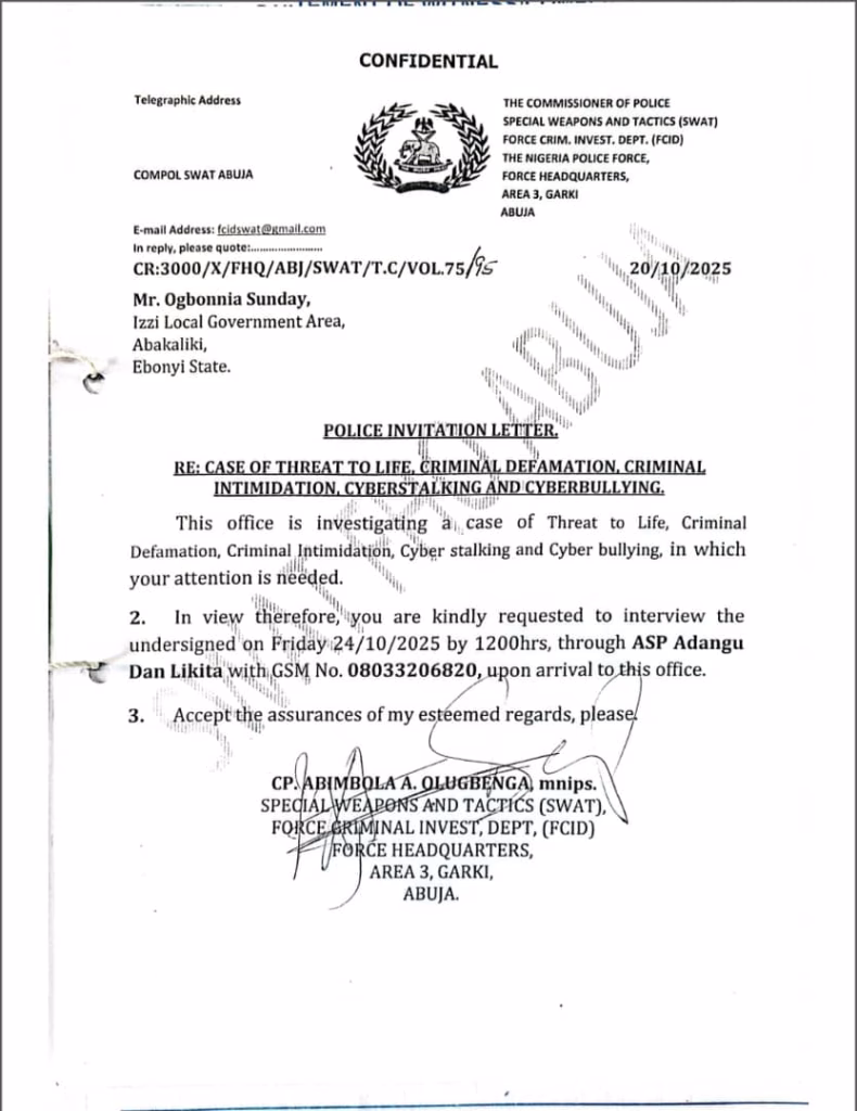 In a police invitation letter addressed to the accused and originated from the office of the Commissioner of Police, Special Weapons and Tactics (SWAT) in the office of the IGP of police, the duo of Felix Okemini and Ogbonnia Sunday were requested to attend an “interview” in the IGP office on the allegations preferred against them.