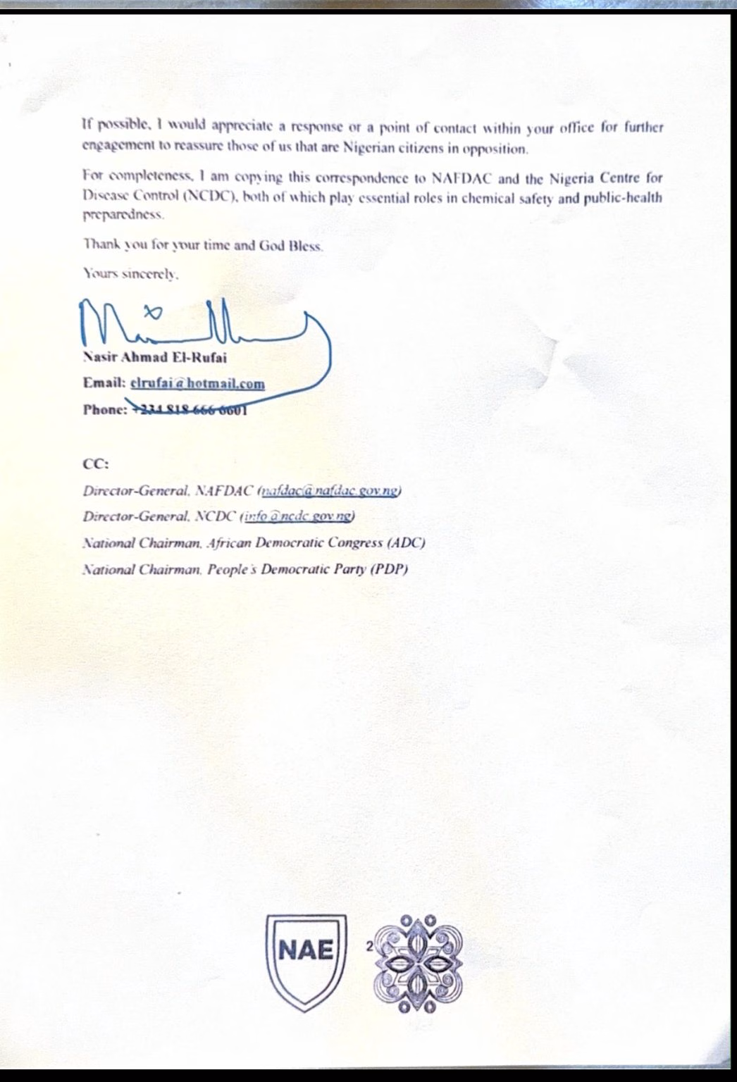 In the letter addressed to the NSA El Rufai gave further details saying, “I am writing as a concerned citizen to seek clarification and reassurance regarding information available to the political opposition leadership about a procurement of approximately 10 kilograms of Thallium Sulphate by the Office of the National Security Adviser (ONSA), reportedly from a supplier in Poland.”