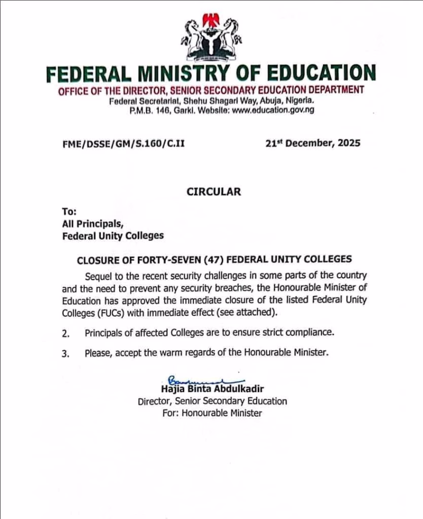 The Fedderal Ministry of Education has announced the closure of 47 Federal Government Colleges across Northern Nigeria.