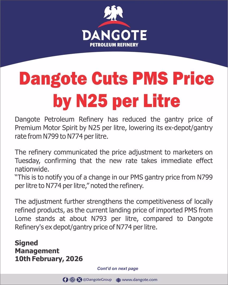 The Dangote Refinery has announced the reduction of the pump price of petrol by N25, from N799 T0 N774.