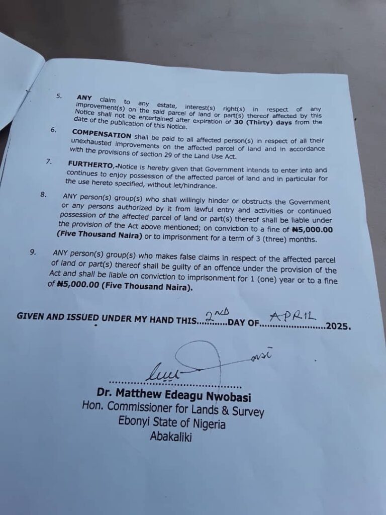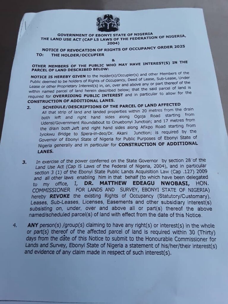 A notice issued on April 2, 2025 by Dr. Matthew Edeagu Nwobasi, commissioner for lands and Survey, quoting the land use Act (15 law of the federation 2024), said “the strips of land 20 metres both left and right along Ogoja and Afikpo road have been revoked for public interest.”