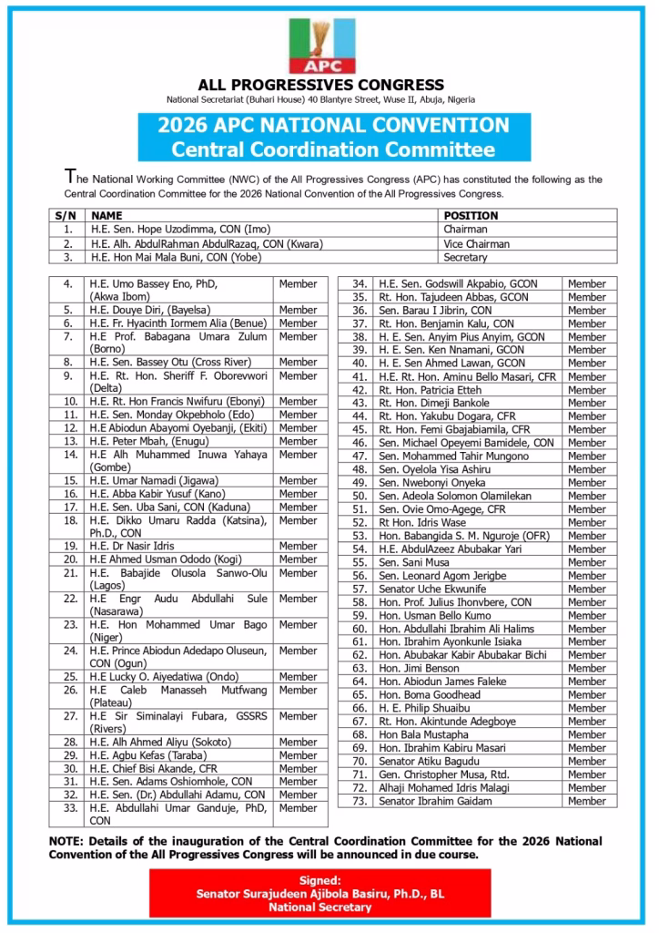 The party also stated that “The Governor of Imo State and Chairman of the Progressive Governors’ Forum (PGF), H.E. Sen. Hope Uzodimma, has been appointed Chairman of the 73-member Central Coordination Committee for the 2026 National Convention of the All Progressives Congress (APC).