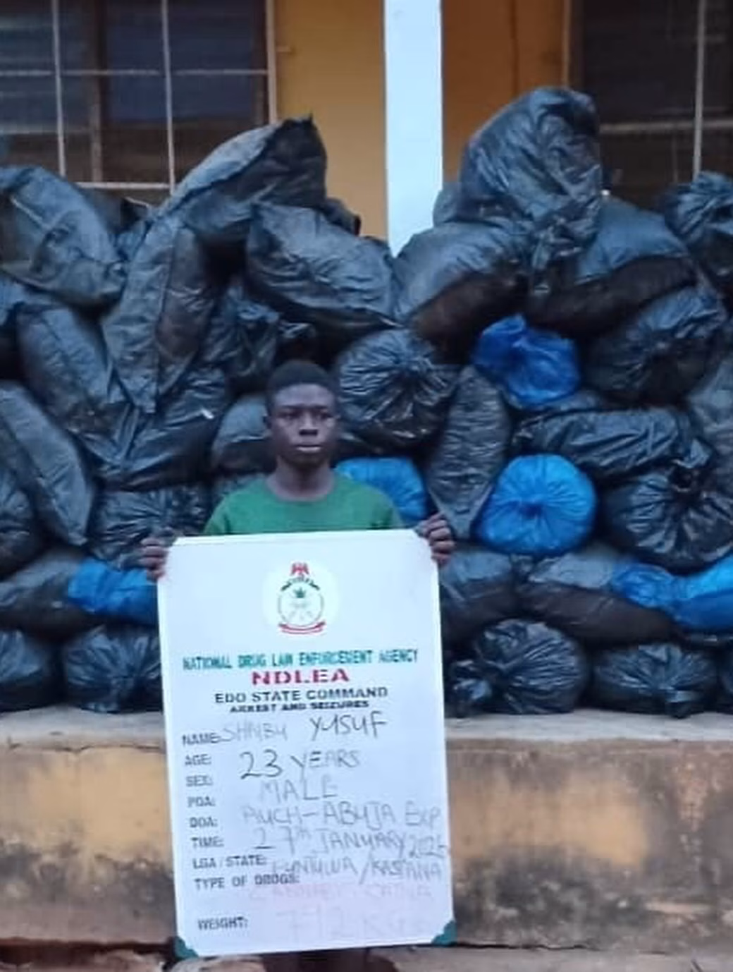 In another interdiction operation, NDLEA operatives in Edo state on Tuesday 27th January arrested Shaibu Yusuf along Auchi-Abuja express road while looking for a vehicle to convey 66 bags of skunk concealed in bags of charcoal, weighing 792kg, to Katsina. Also, in Edo, operatives supported by Nigerian Army personnel on Wednesday 28th January raided a cannabis farm at  Ebora camp, Ilushi in Esan South East LGA where 4,063.675kg skunk was destroyed on over 1.6 hectares farmland while 328kg processed cannabis and its seeds were recovered. Suspects arrested at the camp include: Jeremiah Nwodeh, 46; Chukwudi Pius,33;