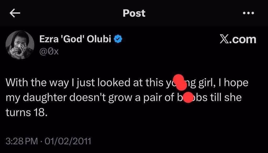 Olubi has been trending in the social media over a series of his social media posts that suggest sexual deviance including sexual innuendos about minors and bestiality.