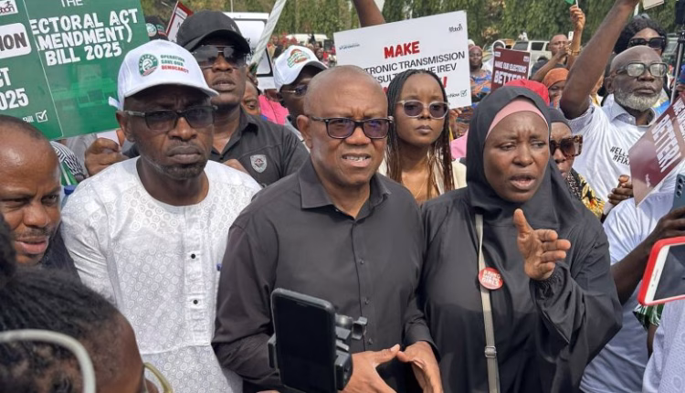 Peter Obi, CSOs Protest at National Assembly Over Removal of Electronic Transmission of Votes from Electoral Act