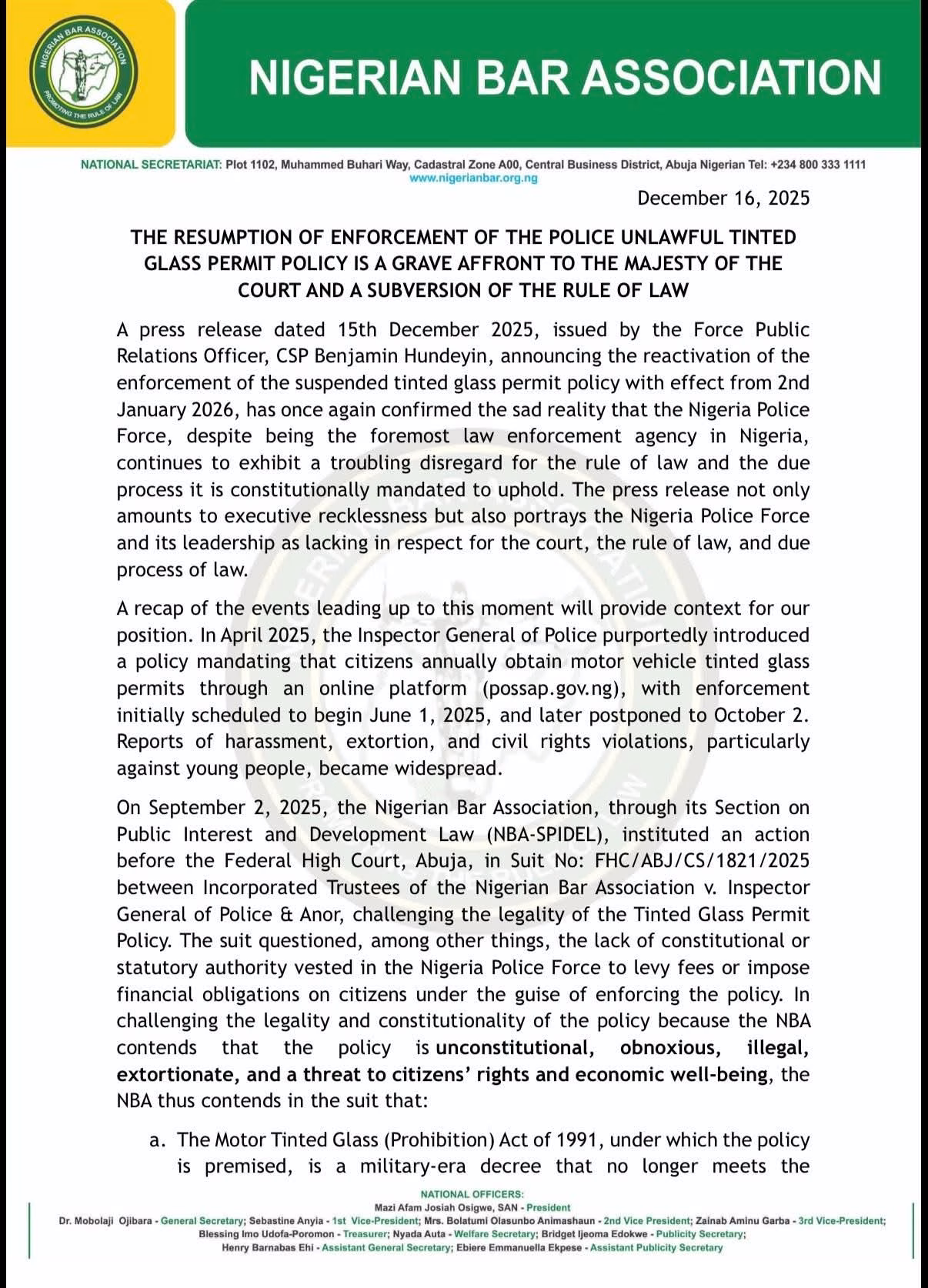 Accordingly, the Nigerian Bar Association calls on the Inspector General of Police to immediately withdraw the statement issued by CSP Benjamin Hundeyin and halt all attempts to reactivate enforcement of the tinted glass permit policy pending the final determination of all related court actions.