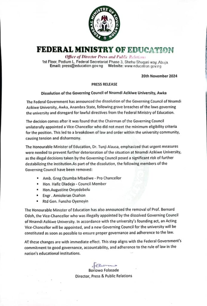 “The Federal Government has announced the dissolution of the Governing Council of Nnamdi Azikiwe University, Awka, Anambra State, following grave breaches of the laws governing the university and disregard for lawful directives from the Federal Ministry of Education