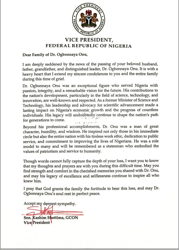 In a letter of tribute the Vice president personally addressed to the family of the deceased first Executive Governor of Abia State, VP Shettima recounted the immense contributions of late Dr. Onu, especially in the areas of advancement of science and technology in Nigeria both as a scientist and later a minister of Science, Technology and Innovation in Nigeria.